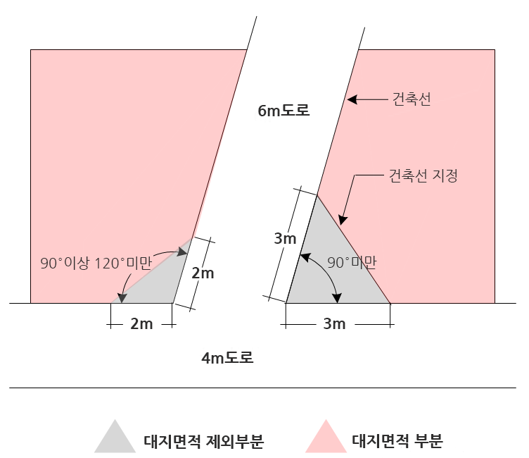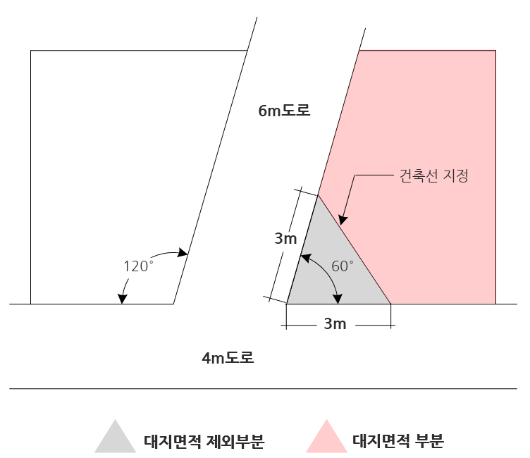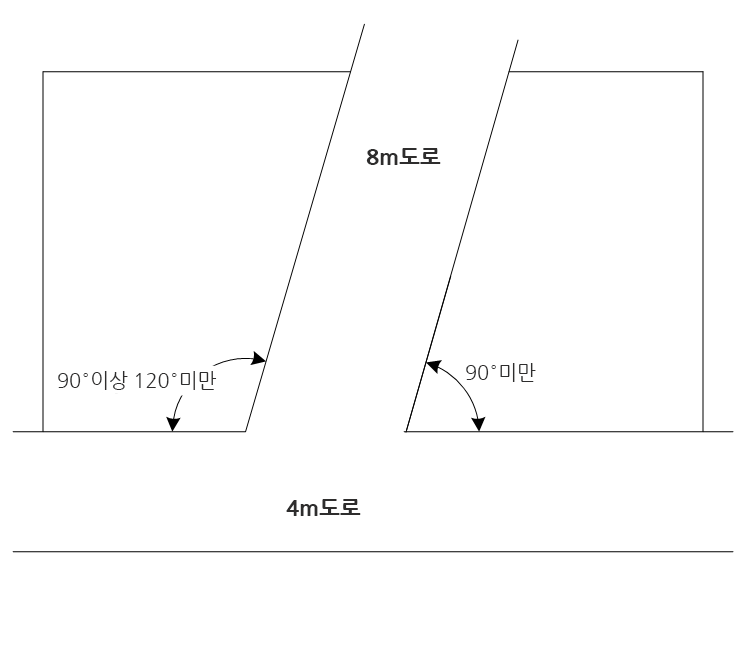 교차되는 두 도로 중 어느 한 도로의 너비가 8m이상이거나 도로의 교차각이 120°이상이라면 교통에 지장이 없다고 판단하여 모퉁이 가각에 의한 건축선지정은 없다.